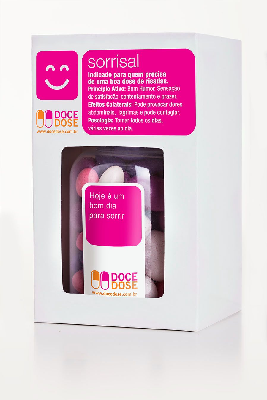 Um frasco recheado com 200g de balas deliciosas nas cores da sua marca, com uma mensagem irreverente e ainda nessa caixinha super charmosa com visor, é a dose perfeita para o sucesso da sua ativação com seus clientes ou colaboradores. Quer um brinde criativo? A Doce Dose está pronta para te atender.