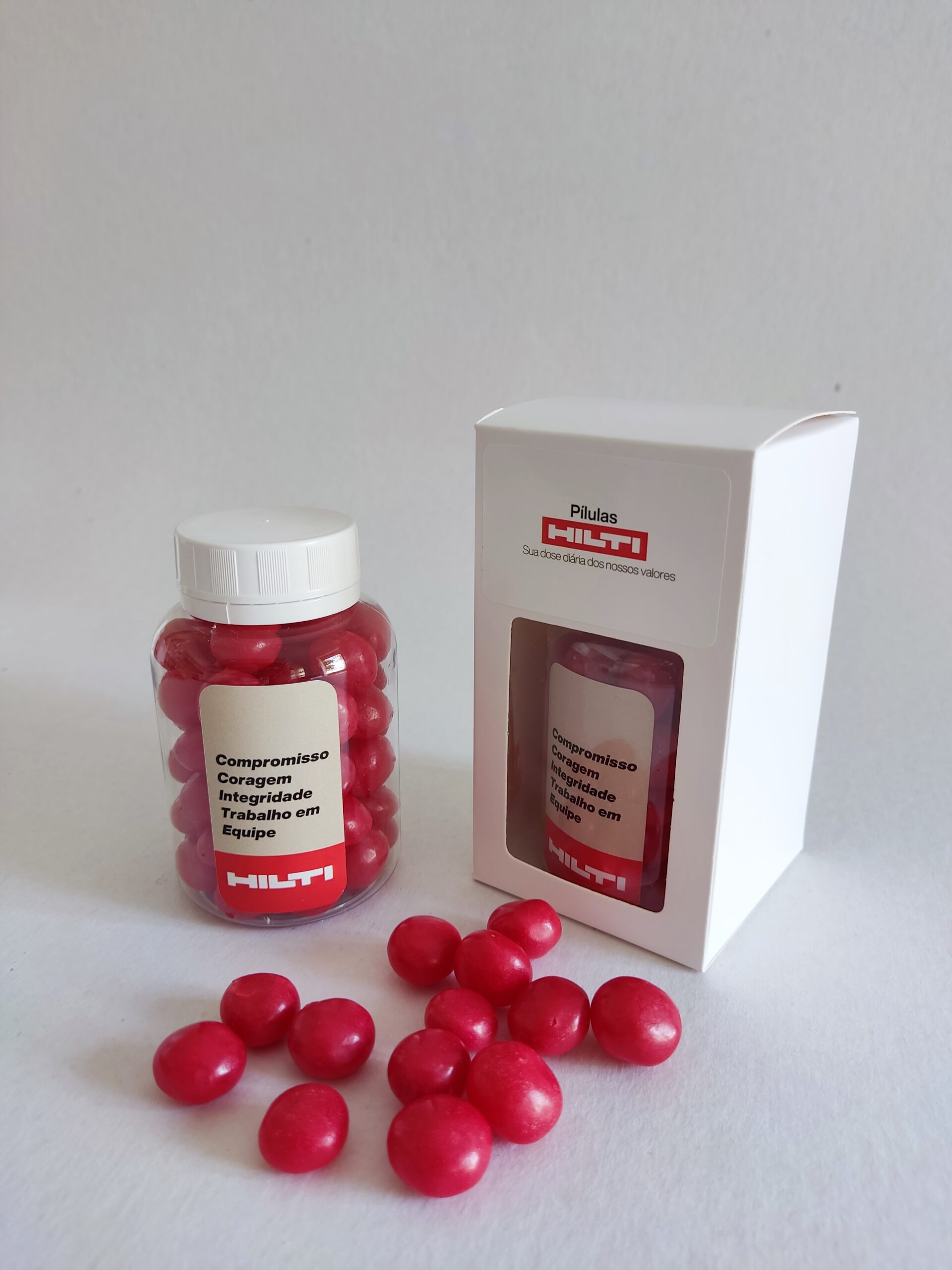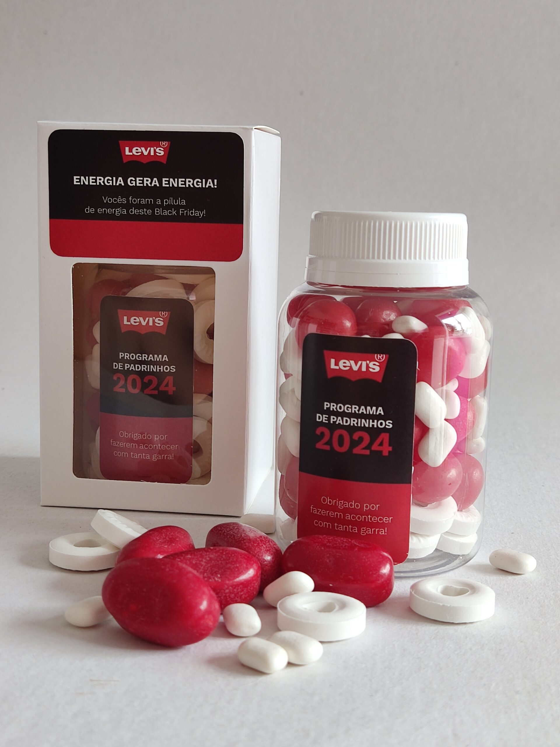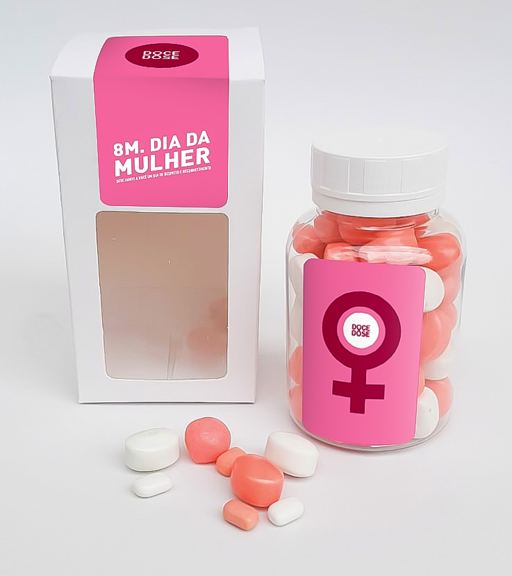 A combinação entre visor transparente, cores das balas e mensagem personalizada cria um resultado equilibrado e altamente positivo. O conjunto dos elementos valoriza o brinde, gera impacto visual imediato e reforça a percepção de cuidado, criatividade e atenção aos detalhes.