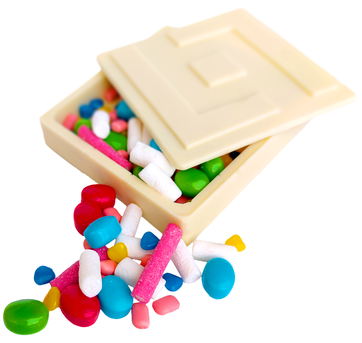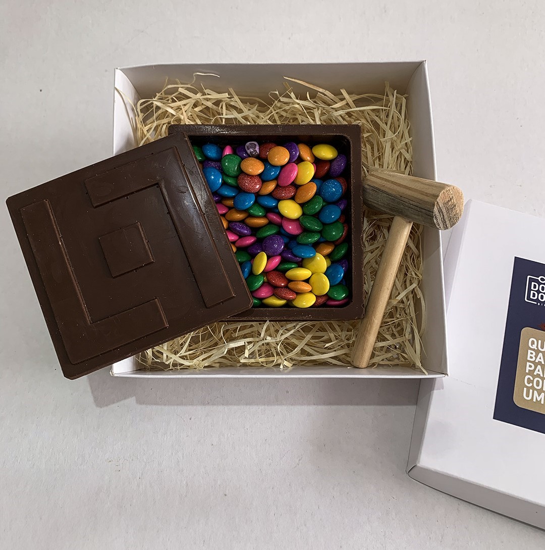 Caixa rígida personalizada | Conteúdo: barra de chocolate para quebra | Acessório: martelinho de madeira | Recheio: confeitos de chocolate, balas ou mix de nuts | Diferencial: efeito surpresa na abertura