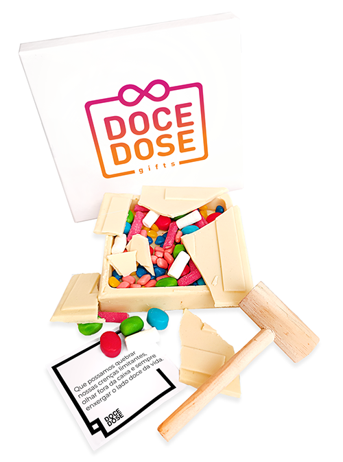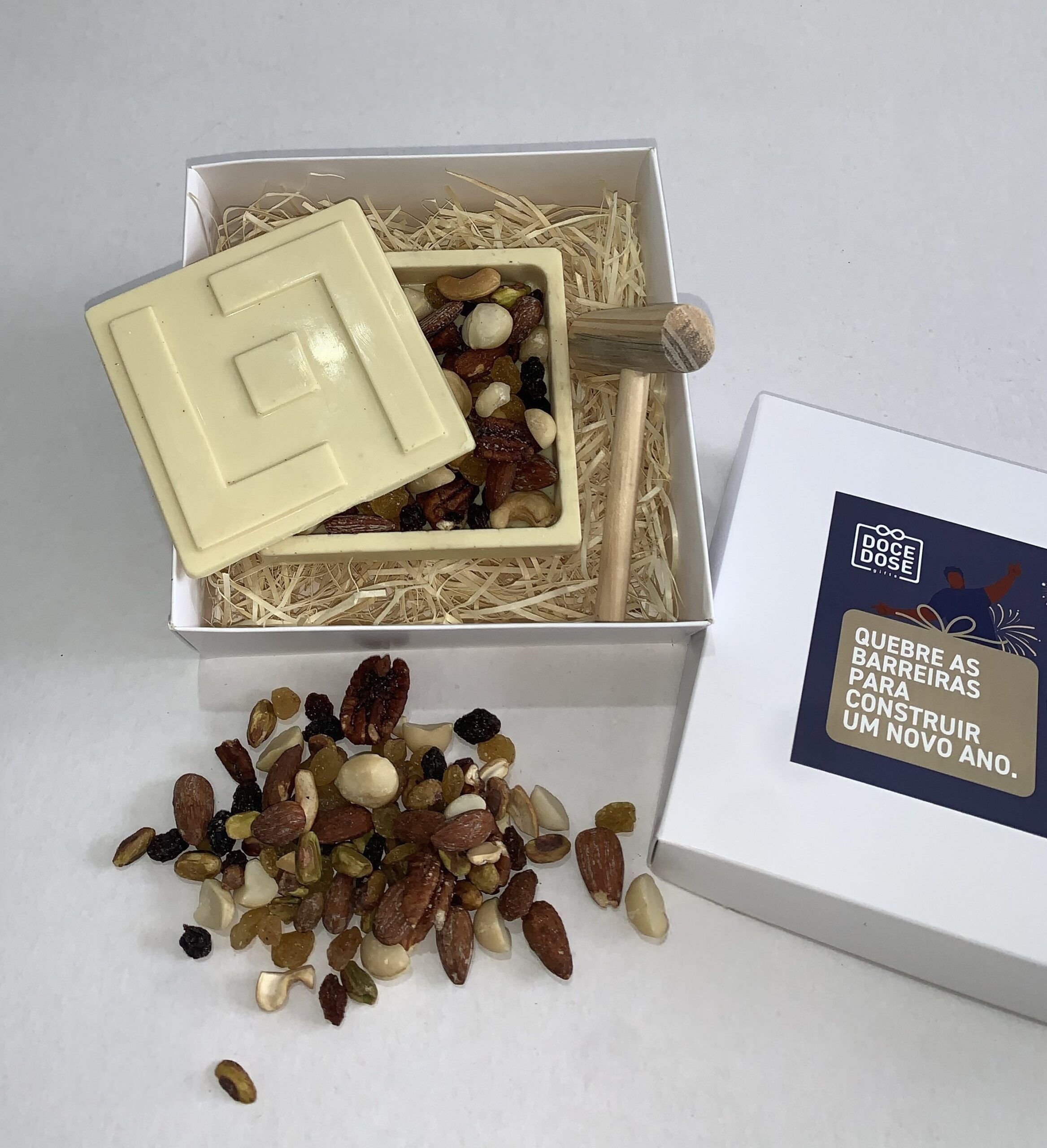 Caixa Quebra Chocolate composta por barra de chocolate moldada para ser quebrada, acompanhada de martelinho de madeira. Ao quebrar o chocolate, o conteúdo interno é revelado, criando uma experiência interativa, sensorial e surpreendente.
