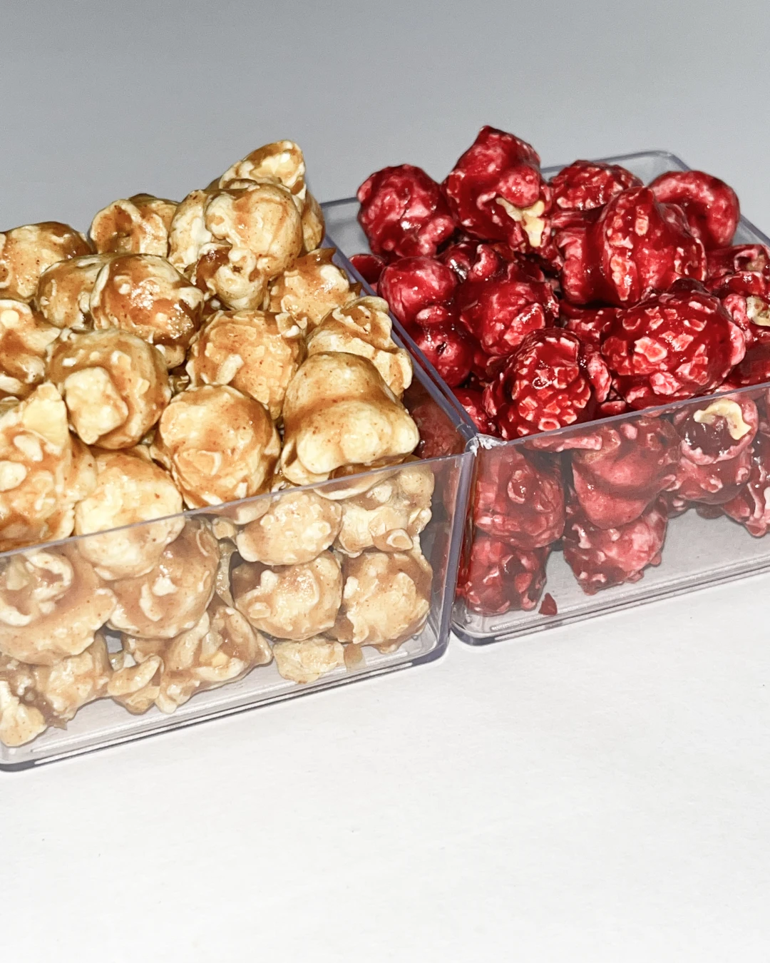 Caixinha de acrílico formato 4 x 4 x 8 cm contendo aproximadamente 40g de pipoca gourmet de diversos sabores e cores, com rótulo e lacre personalizado.