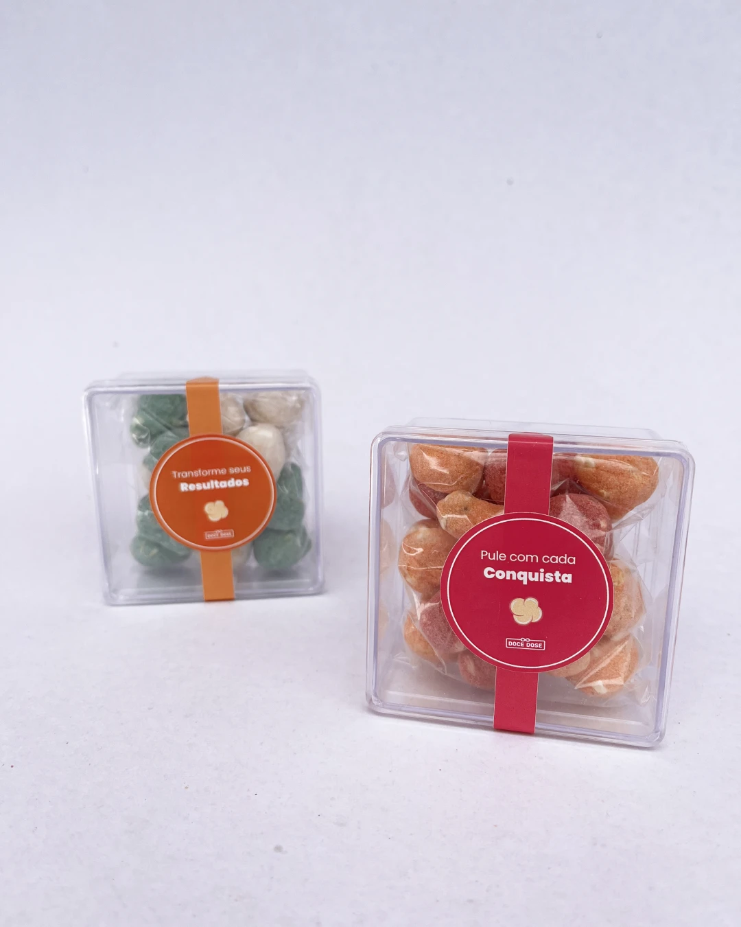 compacta e elegante, nossa caixinha de acrílico com pipocas gourmet é o brinde ideal para transmitir sua mensagem com sofisticação, bom gosto e leveza. O design transparente valoriza as cores e texturas das pipocas enquanto o rótulo diferenciado comunica exclusividade. Perfeita para ações de reconhecimento e ações promocionais.