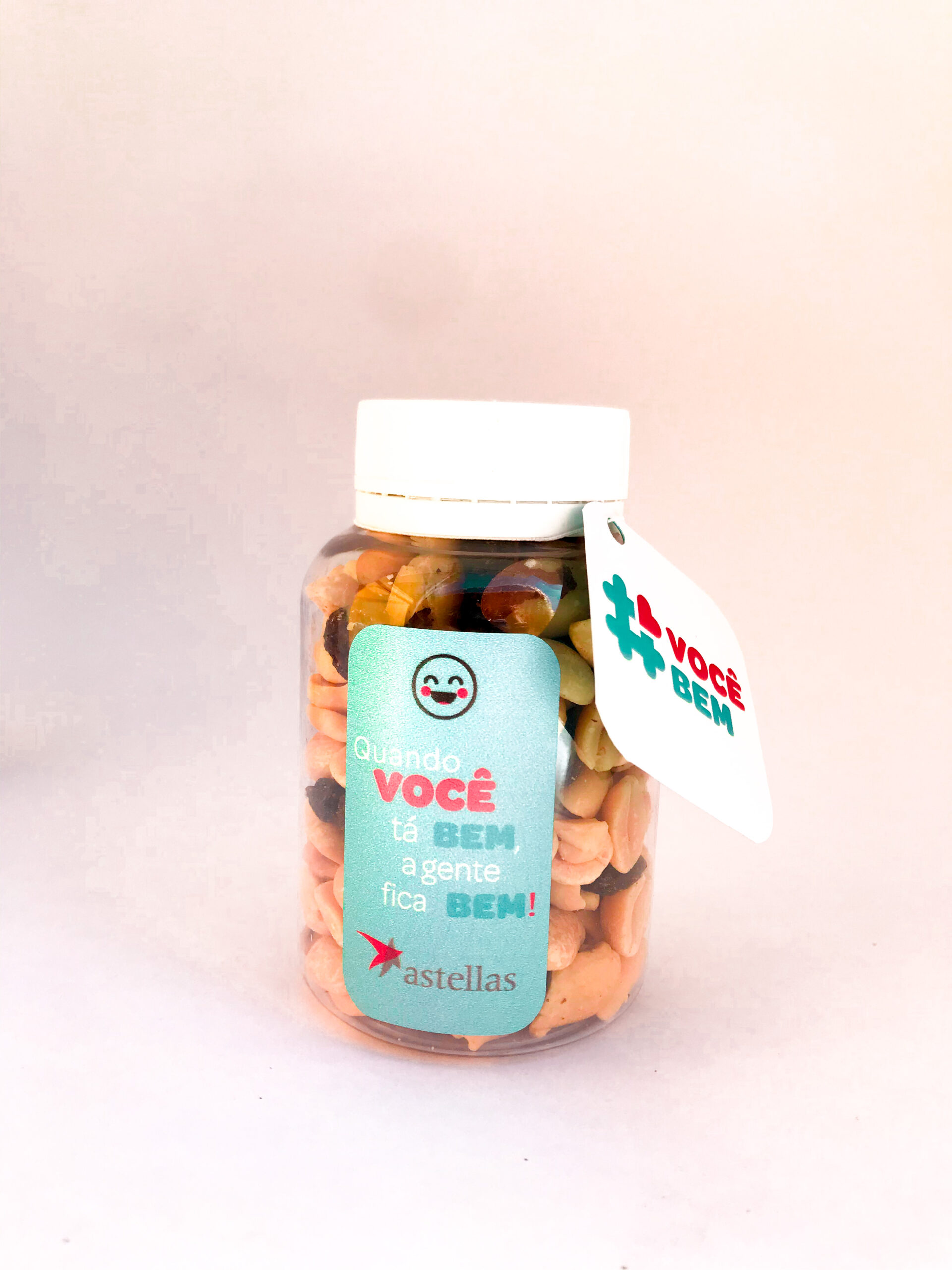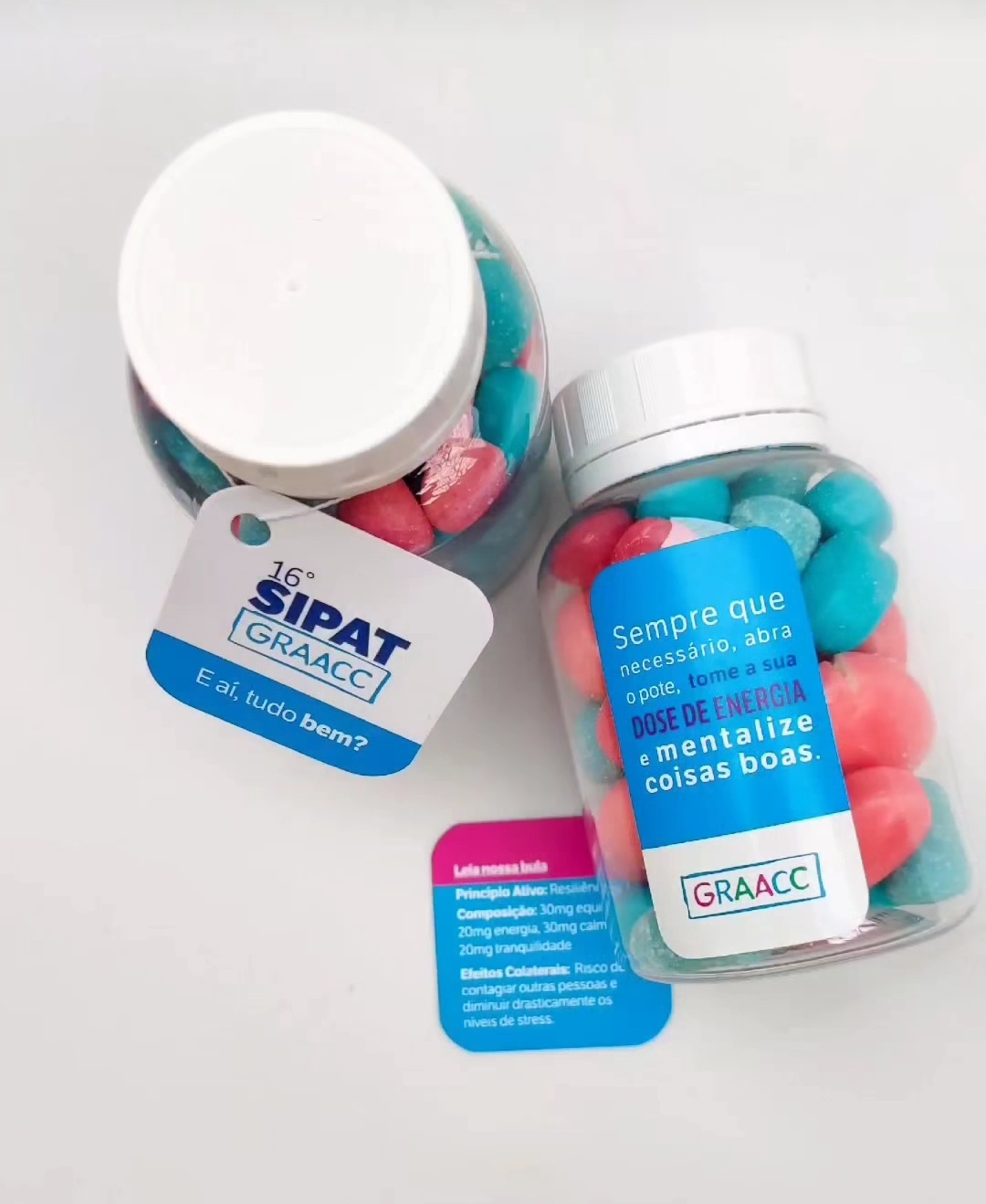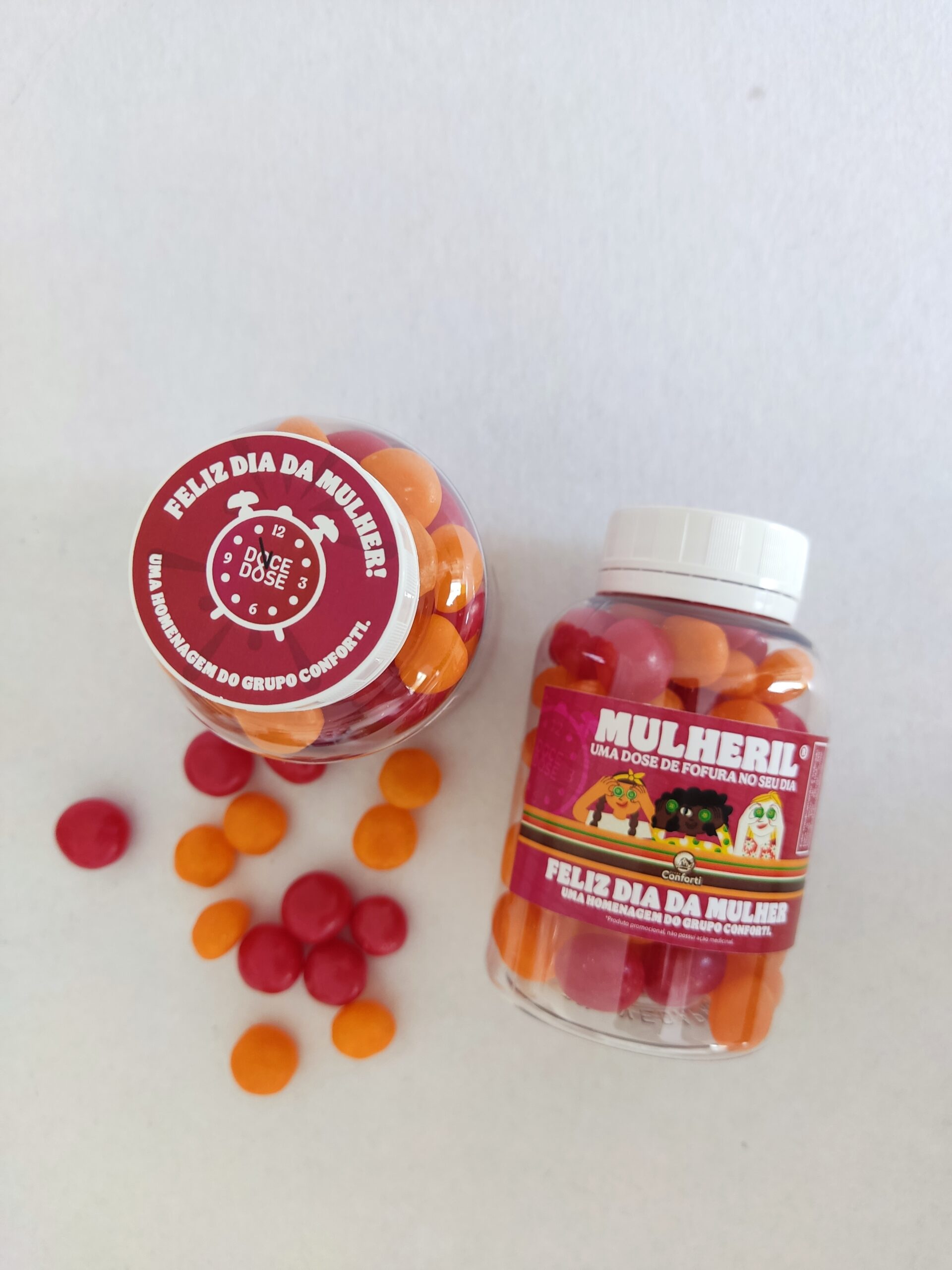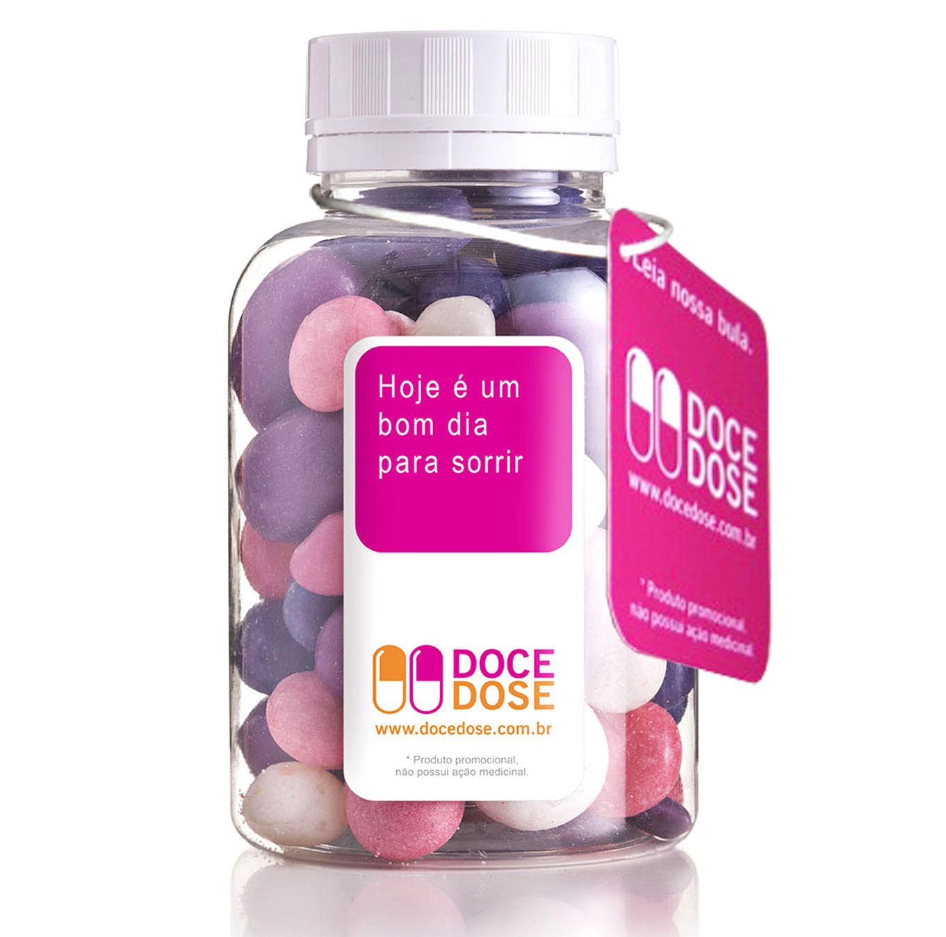 Conteúdo: 200g balas ou confeitos | Embalagem: frasco transparente individual | Tampa: rosca com lacre | Personalização: rótulo e tag personalizados + cores das balas ajustáveis conforme identidade da marca ou da ação