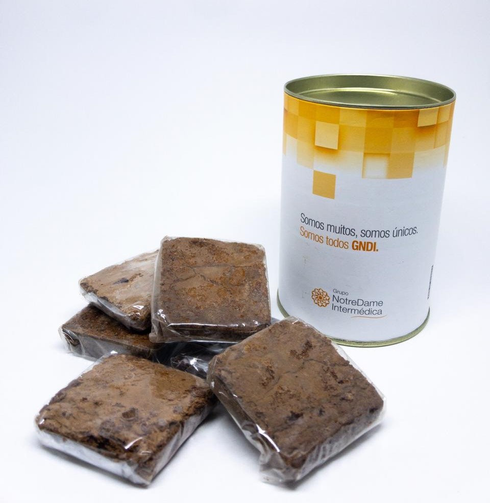 Lata metálica formato tubo com tampa | Conteúdo: 6 brownies individuais embalados em papel celofane | Personalização: identidade visual aplicada na lata | Apresentação premium e reutilizável
