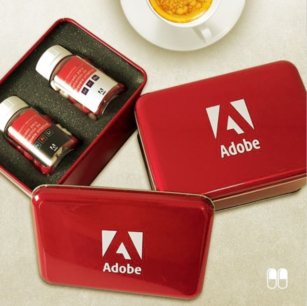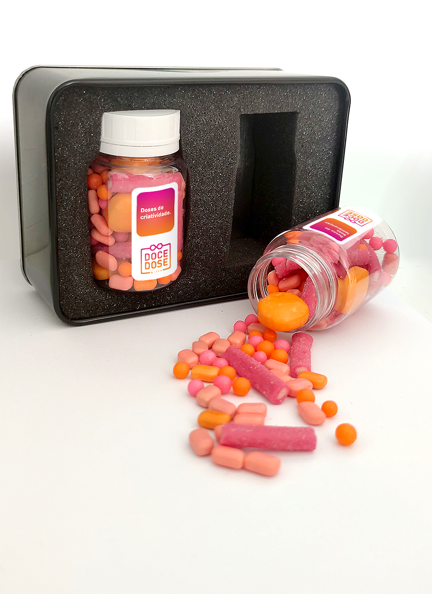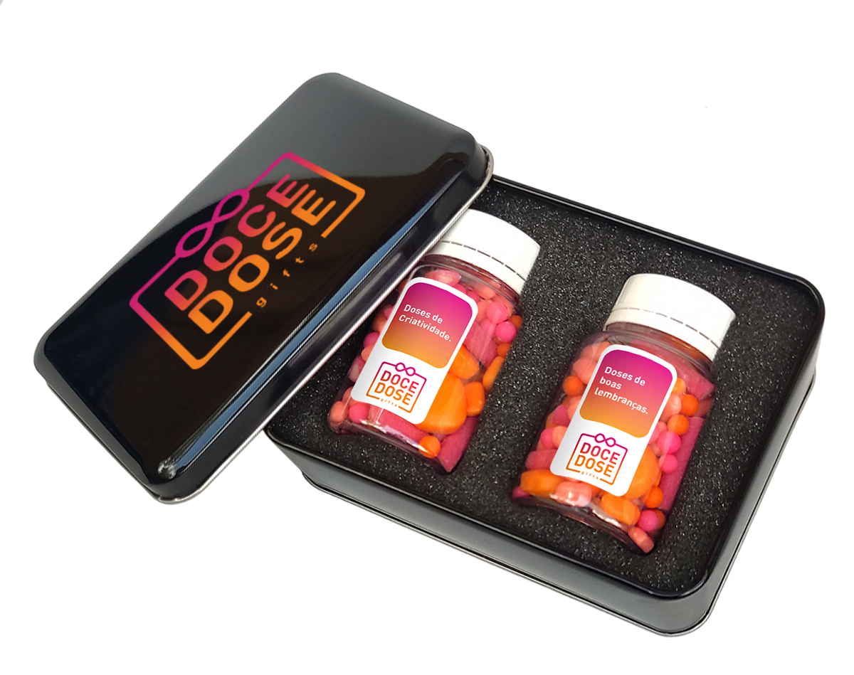 Lata de metal com tampa sobreposta | Conteúdo: 2 frascos transparentes com balas | Acondicionamento interno: berço de espuma | Personalização: identidade visual na lata + rótulos dos frascos | Balas: cores à escolha do cliente ou sortidas