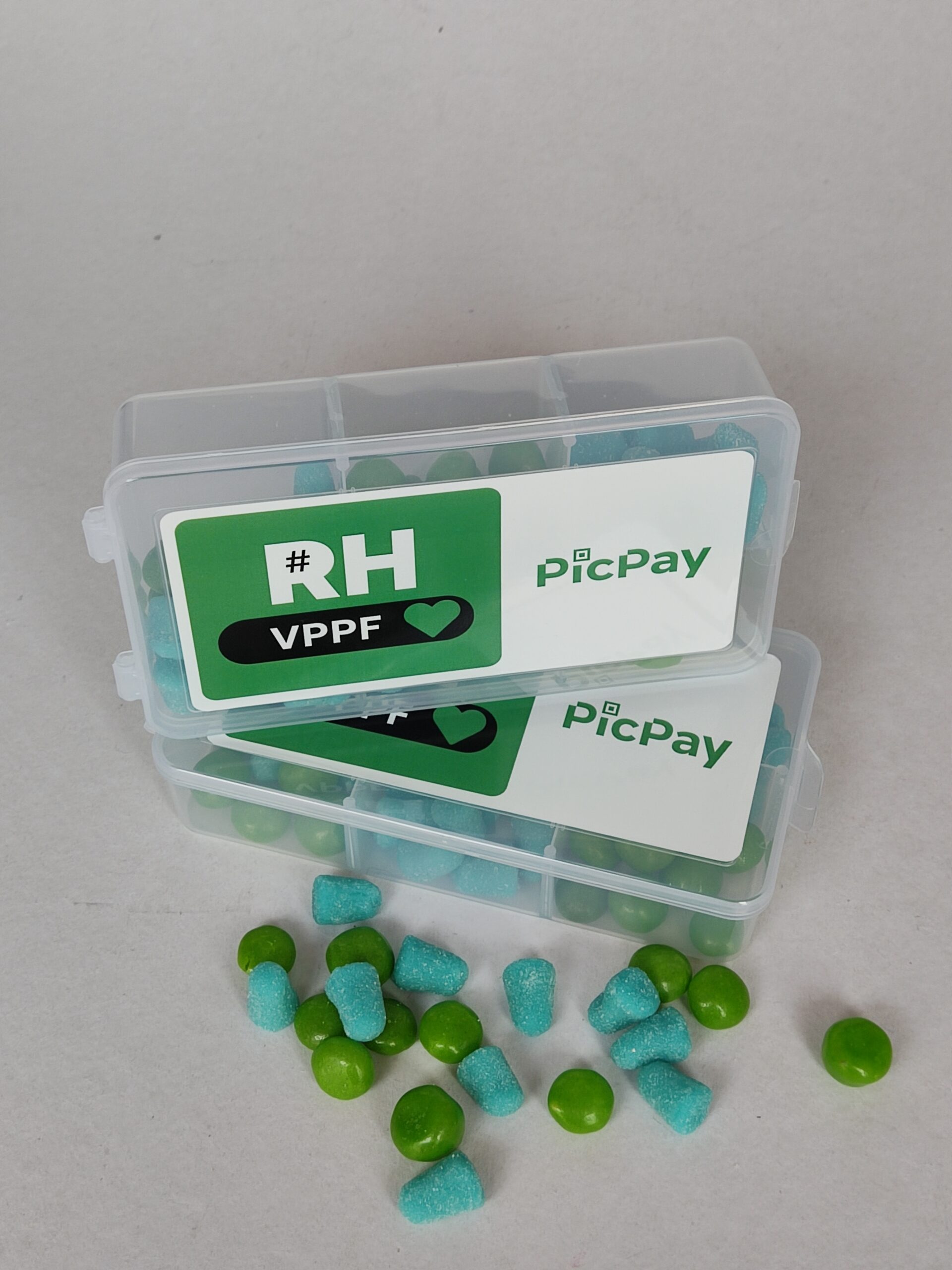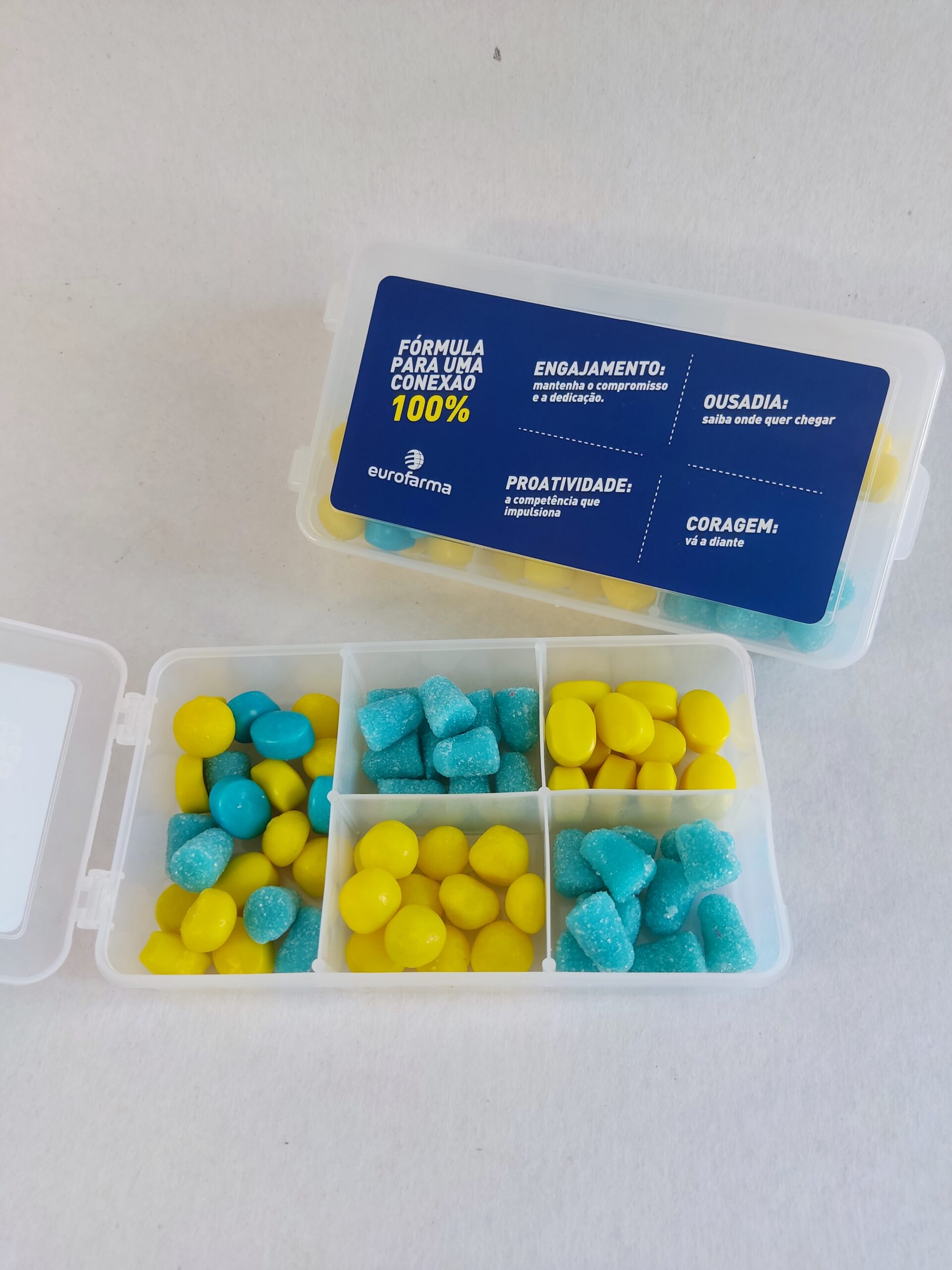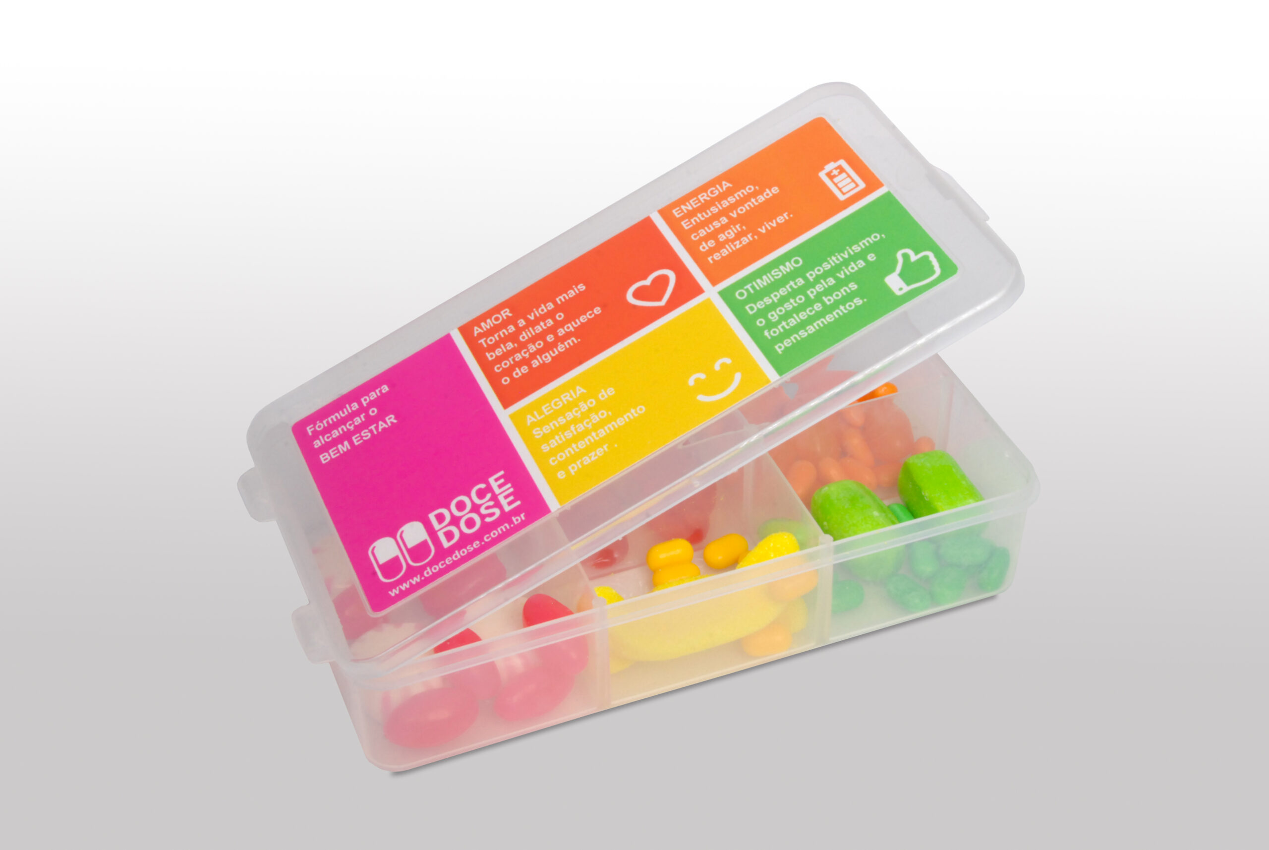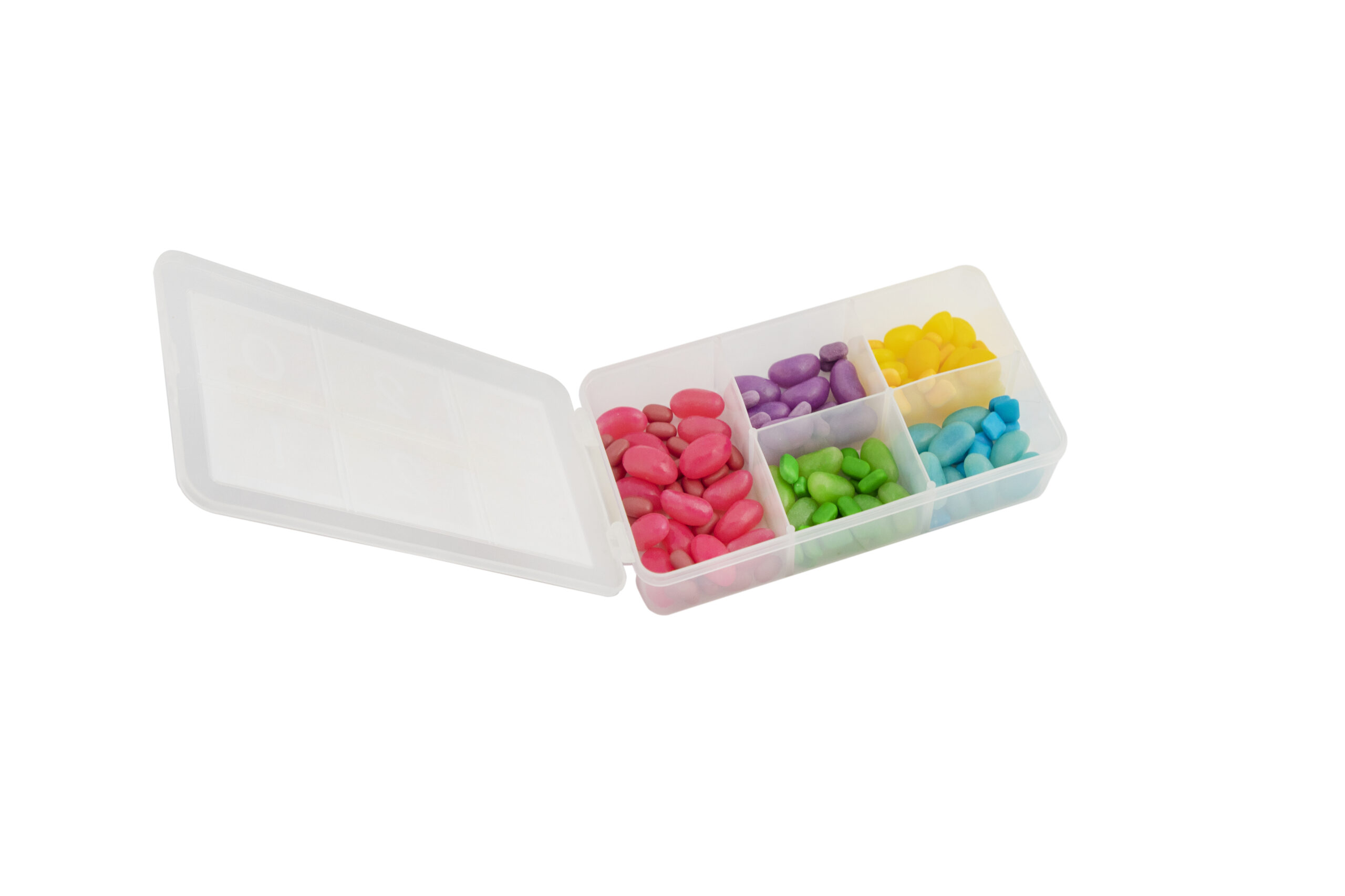 Mini caixa organizadora em material plástico transparente, com divisões internas, desenvolvida para acomodar balas de forma organizada e visualmente atrativa. O formato valoriza a distribuição do conteúdo por compartimentos e facilita o uso no dia a dia.