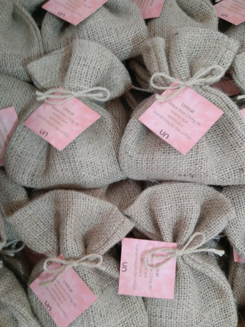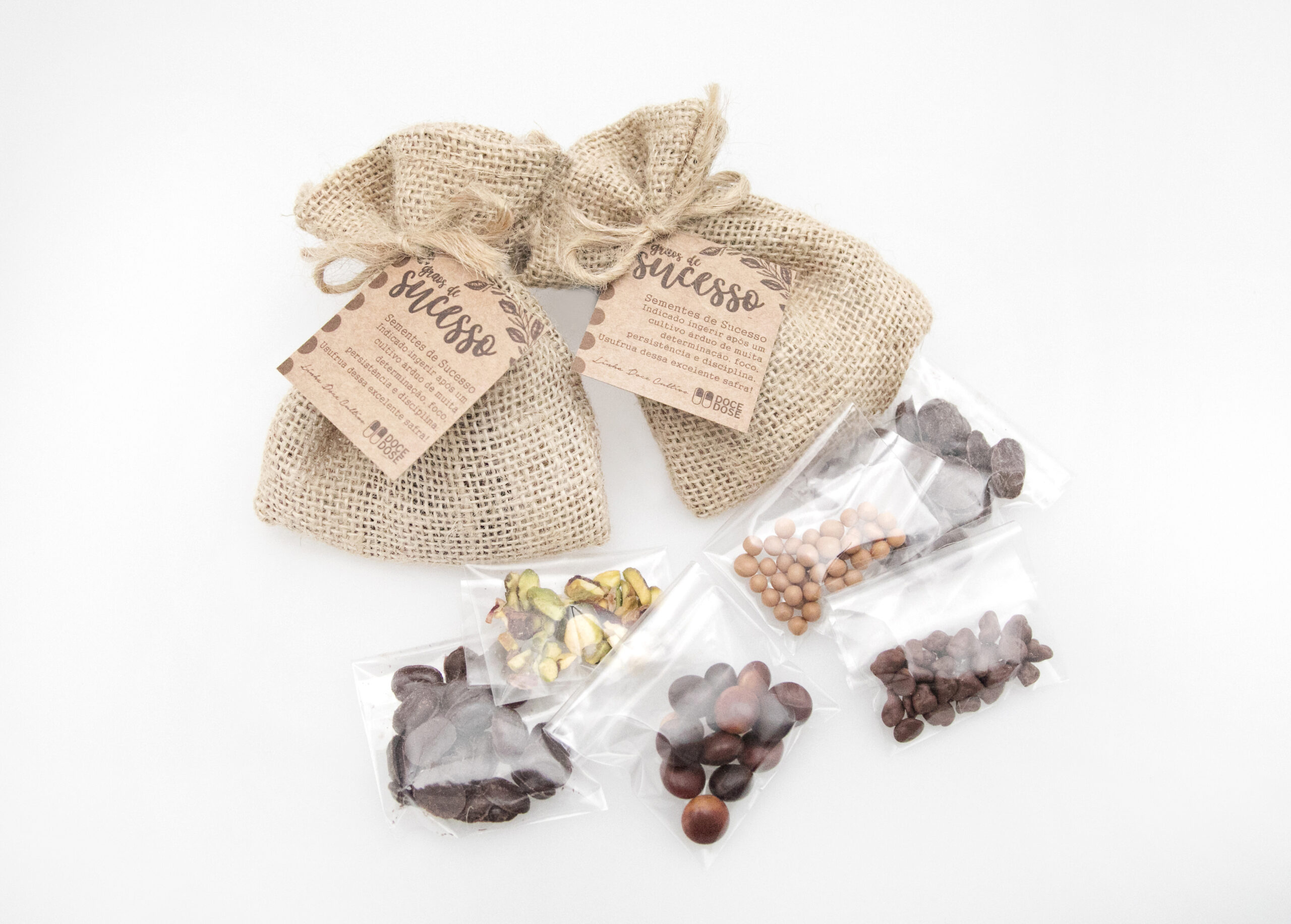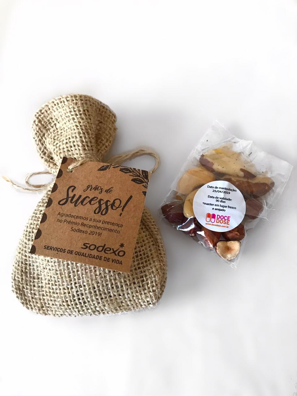 Mix de Nuts saudáveis ou chocolate em formato de grãos de café nesse lindo saquinho de juta com tag personalizada. Para cultivar o sucesso na sua empresa, plantar sementes de motivação na sua equipe ou celebrar os frutos de bons resultados. Independente do motivo, a boa safra é garantida em sua ação com esse brinde. Exclusivo Doce Dose!